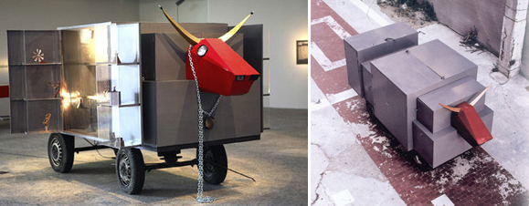 Lina explica: “Gran Vaca Mecánica – Objeto escultórico / Instalación sonora y luminosa / Contenedor – expositor articulado de objetos de artesanía popular brasileña – “el cuarto de los milagros”.Es un objeto que presenta –expone-, la auténtica artesanía, aquella que muestra su belleza en objetos hechos a mano utilizando pocos recursos.Posee una gran riqueza expresiva.