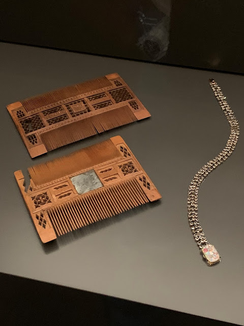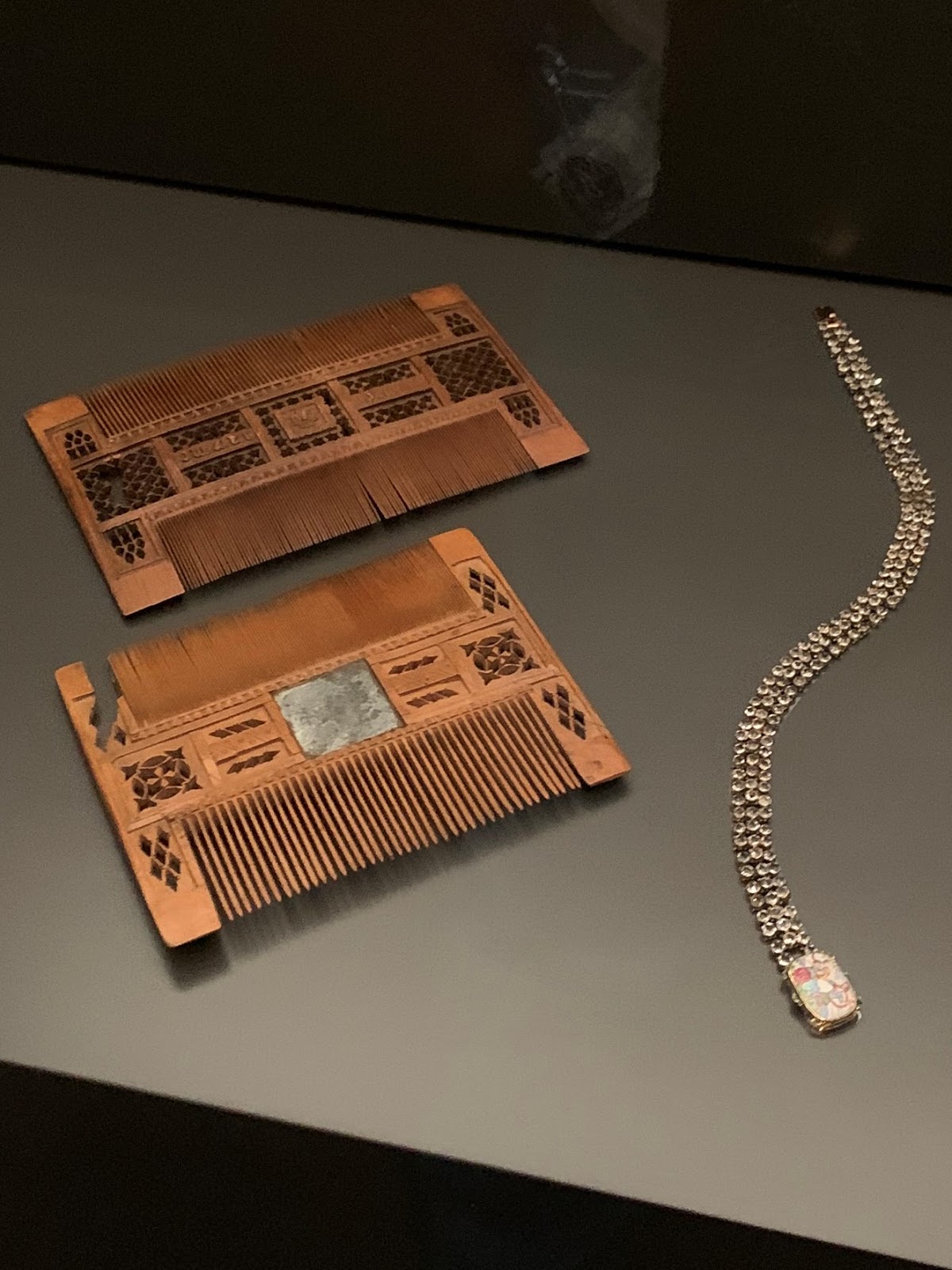 Se exhiben peines y otros objetos relacionados con la belleza y la vanidad, regalos a menudo como “prendas de amor”.