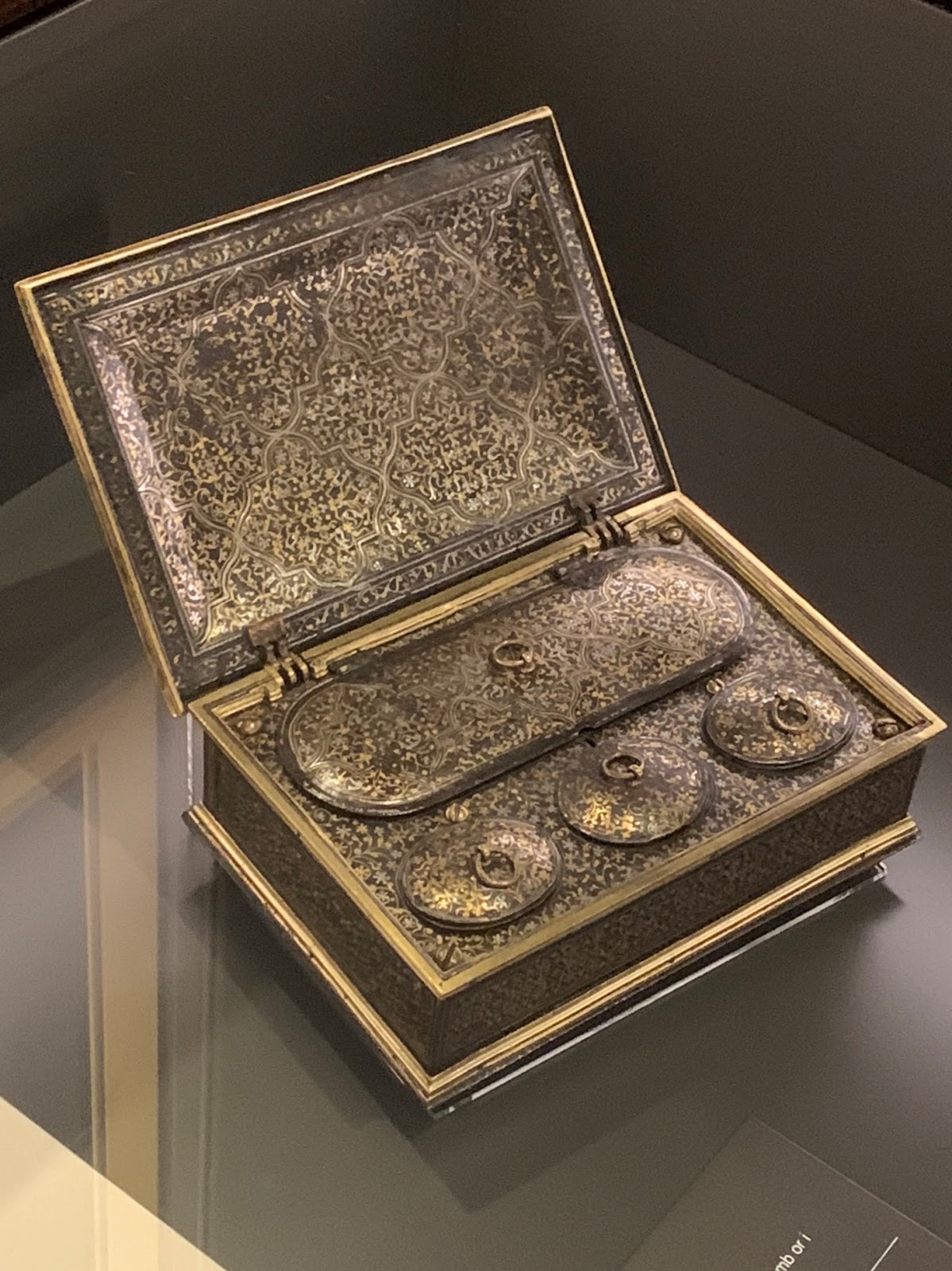 Hierro, añilado y damasquinado con oro y estampados árabes de plata. Legado por el coleccionista australiano/británico George Salting (1835-1909).