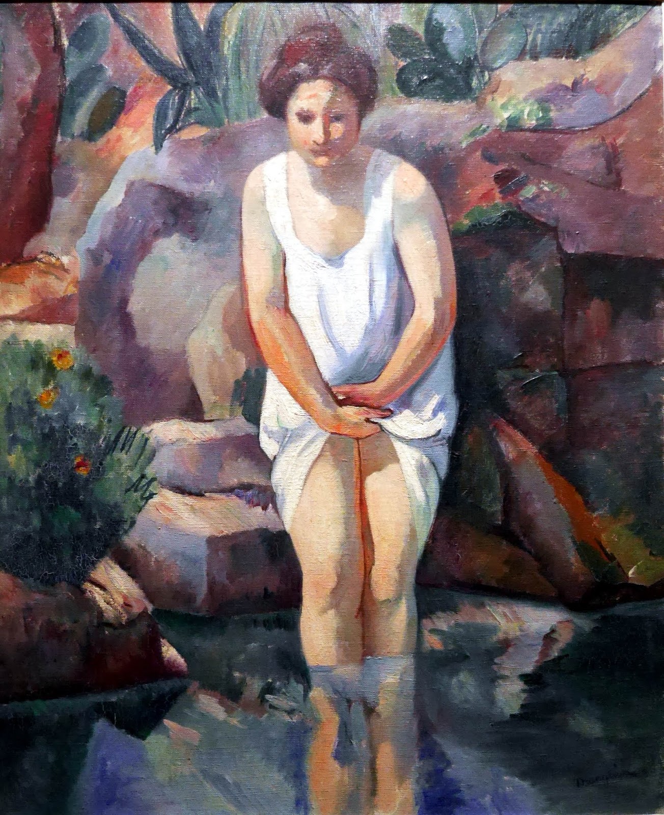 En esas temporadas, la pintura de Manguin como la de Camoin, se tornó en su etapa fauve, más equilibrada con una gama cromática basada en el naranja, el, verde tierno y el azul, produciendo armonías más suaves. Su pintura serena enmarcaba la descripción de una vida en la que el tiempo parecía transcurrir con una serenidad perfecta. Manguin con sus mujeres, bajo unos árboles, a través de cuyas ramas se filtra la luz mediterránea, transmitió como ningún otro artista la sensación de un mundo feliz y fuera del tiempo. Su modelo en numerosas ocasiones fue su mujer Jeanne, con quien se casó en 1899.